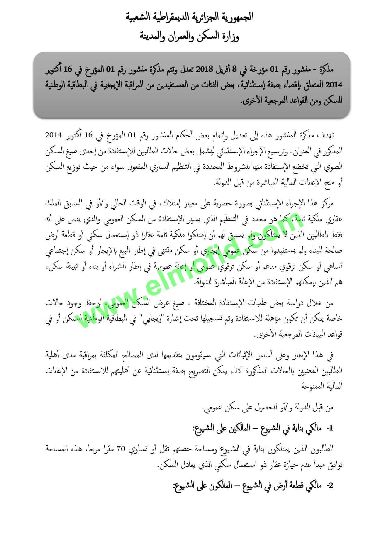 مذكرة – منشور رقم 01 مؤرخة في 8 أفريل 2018 تعدل وتتم مذكرة منشور رقم 01 المؤرخ في 16 أكتوبر 2014 المتعلق بإقصاء بصفة إستثنائية، بعض الفئات من المستفيدين من المراقبة الإيجابية في البطاقية الوطنية للسكن ومن القواعد المرجعية الأخرى.