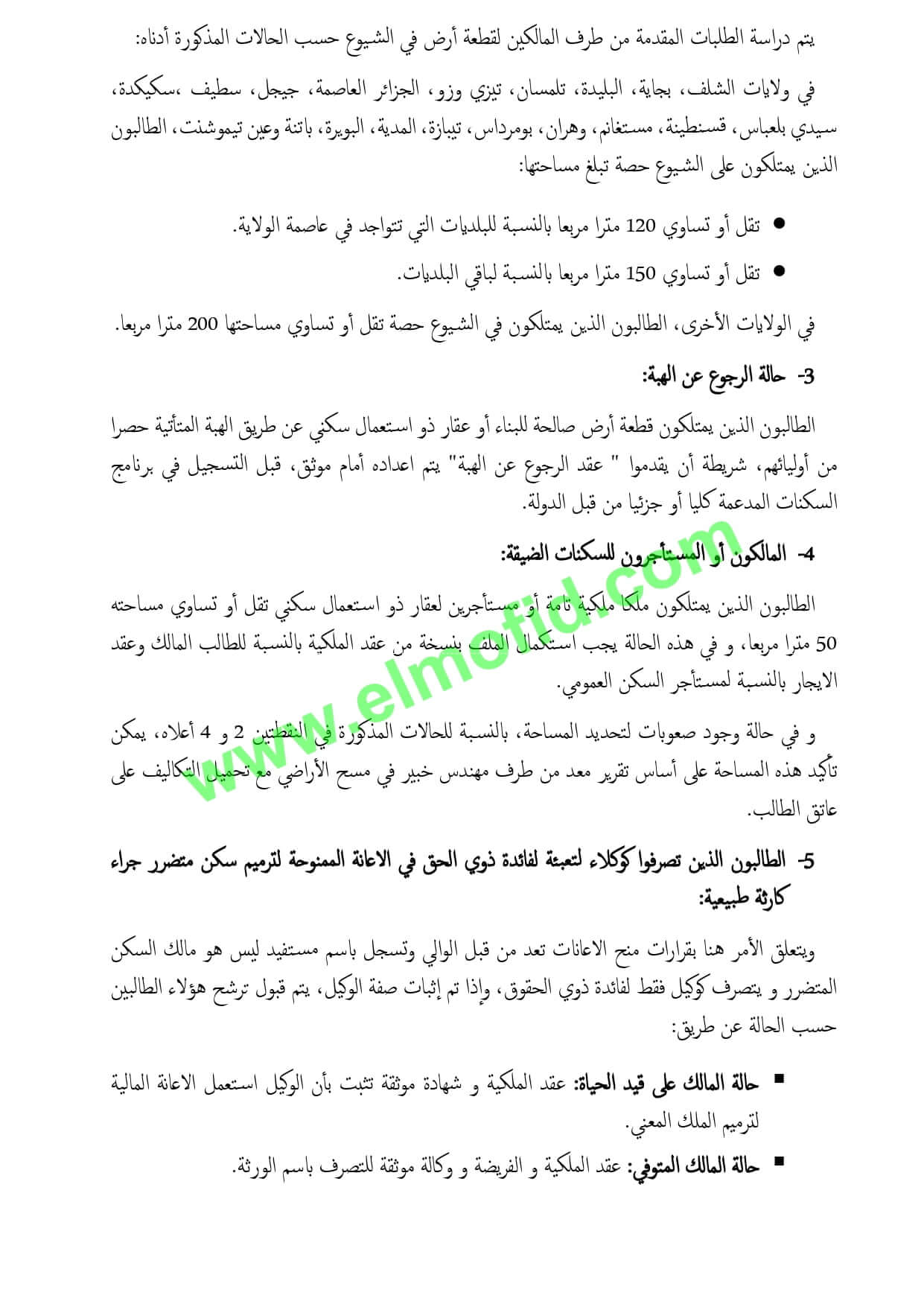 الطالبون الذين يمتلكون قطعة أرض صالحة للبناء أو عقار ذو استعمال سكني عن طريق الهبة المتأتية حصرا من أوليائهم، شريطة أن يقدموا ” عقد الرجوع عن الهبة” يتم اعداده أمام موثق، قبل التسجيل في برنامج السكنات المدعمة كليا أو جزئيا من قبل الدولة.