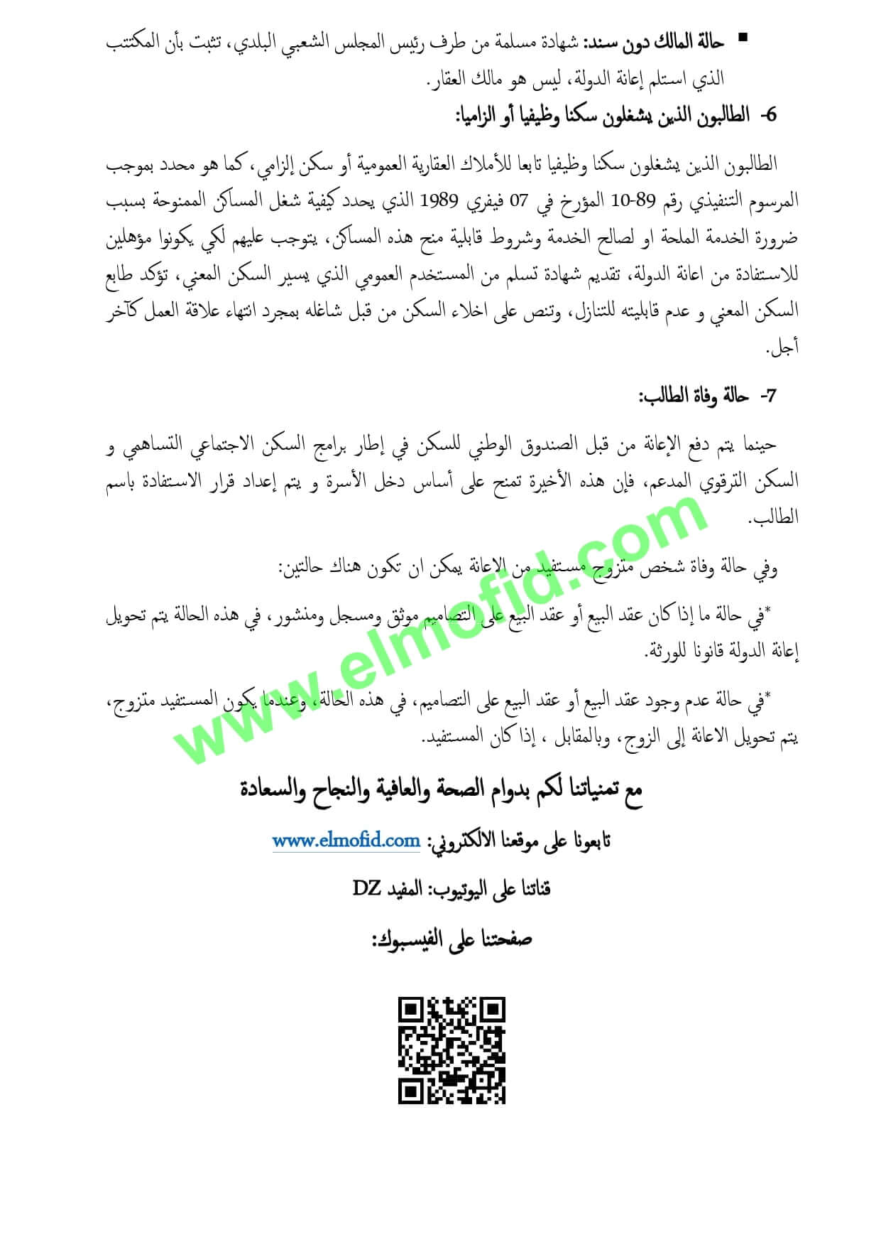 في منشور رسمي السكن العمومي قررت وزارة السكن رسميا اتاحة حق الاستفادة من البرامج السكنية المدعمة لفائدة المواطنين الواردة أسماؤهم في البطاقية الوطنية للسكن دون أن يكون لهم سكن لائق او عقار يمكن لهم التصرف فيه للبناء بشكل فردي، وهو ما يزيل عن المواطنين الكثير من المخاوف وعدم التأكد لدى مكتتبي مختلف الصيغ السكنية خاصة الورثة في أملاك الشيوع ومن يشغلون سكنات وظيفية والسكنات الضيقة.